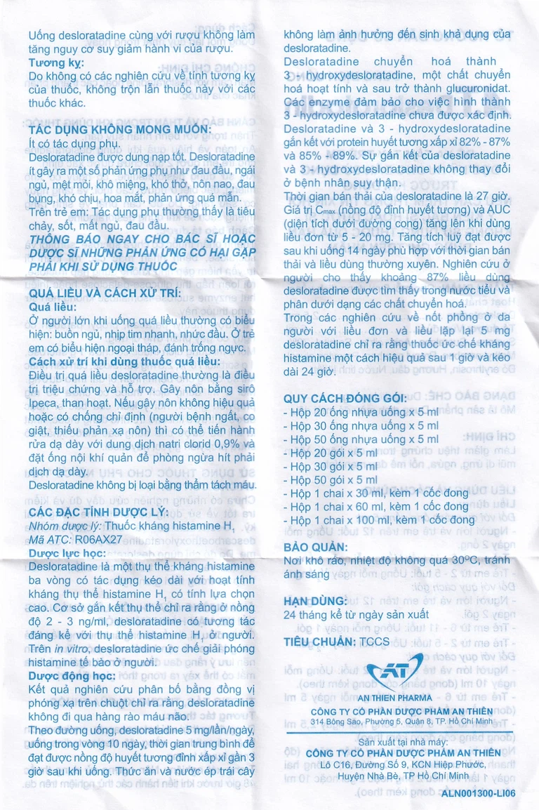 Dung dịch uống A.T Desloratadin 2.5mg An Thiên giảm viêm mũi dị ứng, nổi mày đay mạn tính (30 ống x 5ml)