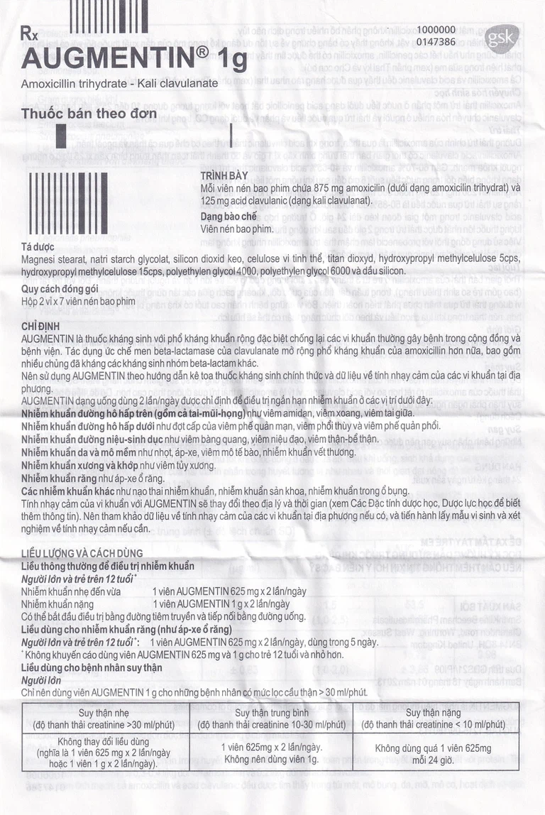 Thuốc Augmentin 1g GSK điều trị nhiễm khuẩn (2 vỉ x 7 viên)