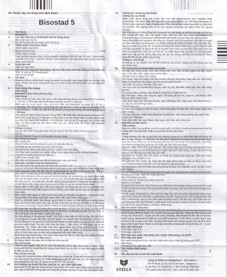 Mô tả ngắn: Bisostad 5 thành phần chính chứa bisoprolol fumarat, được dùng dưới dạng fumarat trong kiểm soát tăng huyết áp và đau thắt ngực. Thuốc còn được dùng phối hợp trị liệu chuẩn trên bệnh nhân suy tim mạn tính ổn định.