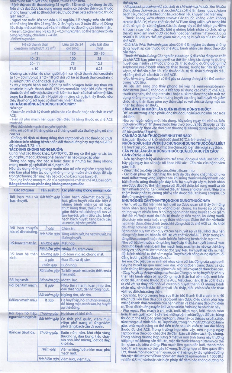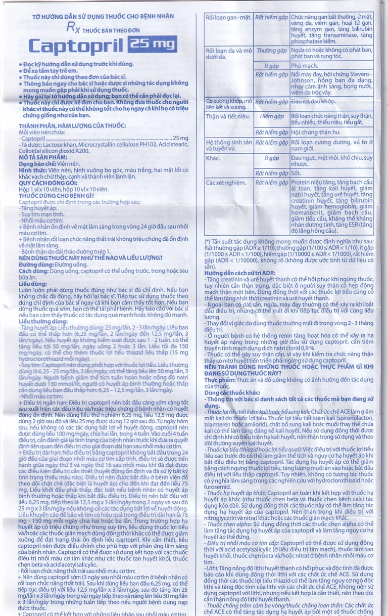 Mô tả ngắn: Captopril là sản phẩm của Công ty Cổ phần Xuất nhập khẩu Y tế Domesco có thành phần chính là Captopril có tác dụng điều trị tăng huyết áp, suy tim, sau nhồi máu cơ tim (ở người bệnh đã có huyết động ổn định).