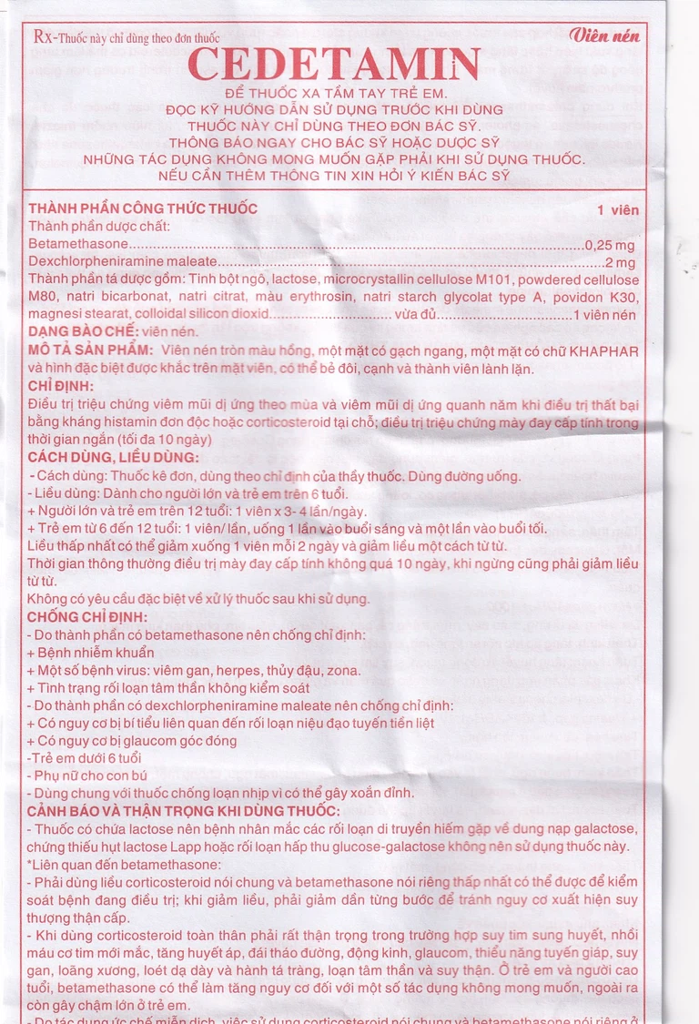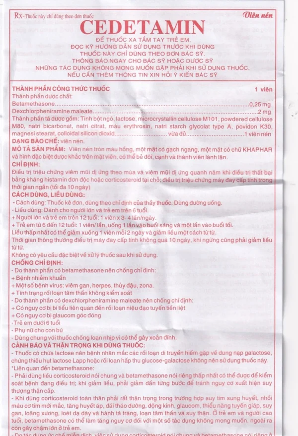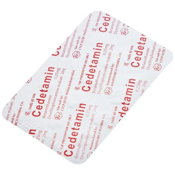Thuốc Cedetamin chứa hai hoạt chất là betamethasone và dexchlorpheniramine maleate.