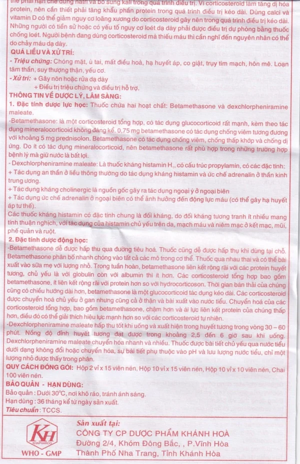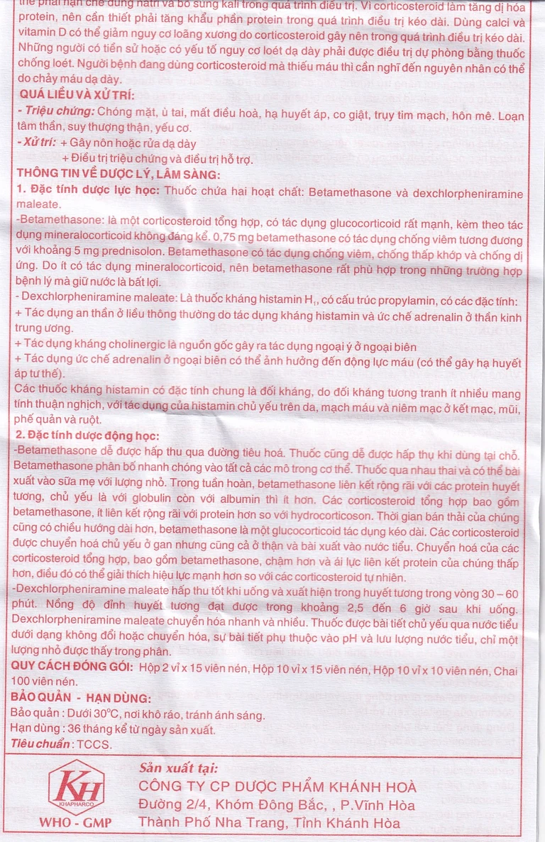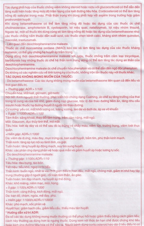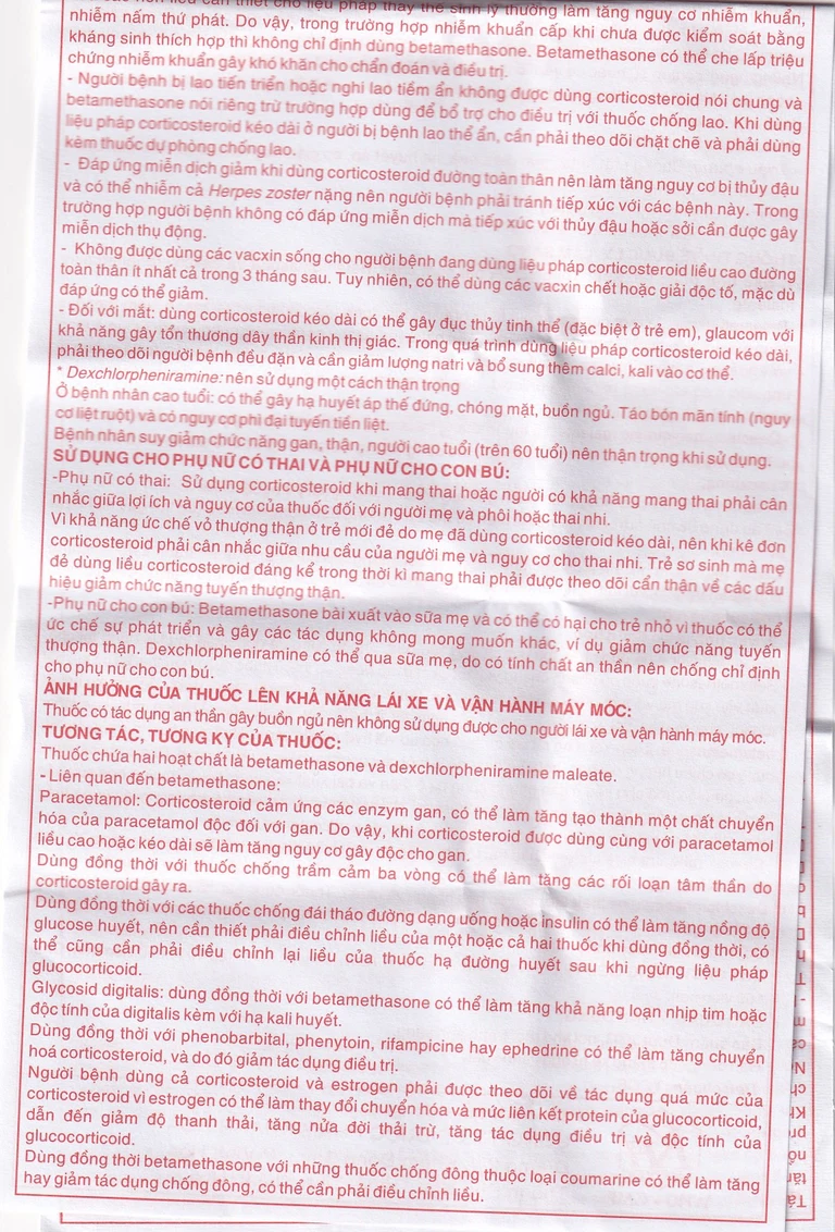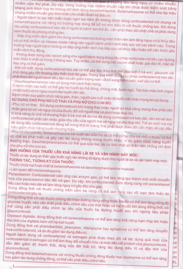 Betamethasone bài xuất vào sữa mẹ và có thể có hại cho trẻ nhỏ vì thuốc có thể ức chế sự phát triển và gây các tác dụng không mong muốn khác, ví dụ giảm chức năng tuyến thượng thận. Dexchlorpheniramine có thể qua sữa mẹ, do có tính chất an thần nên chống chỉ định cho phụ nữ cho con bú.