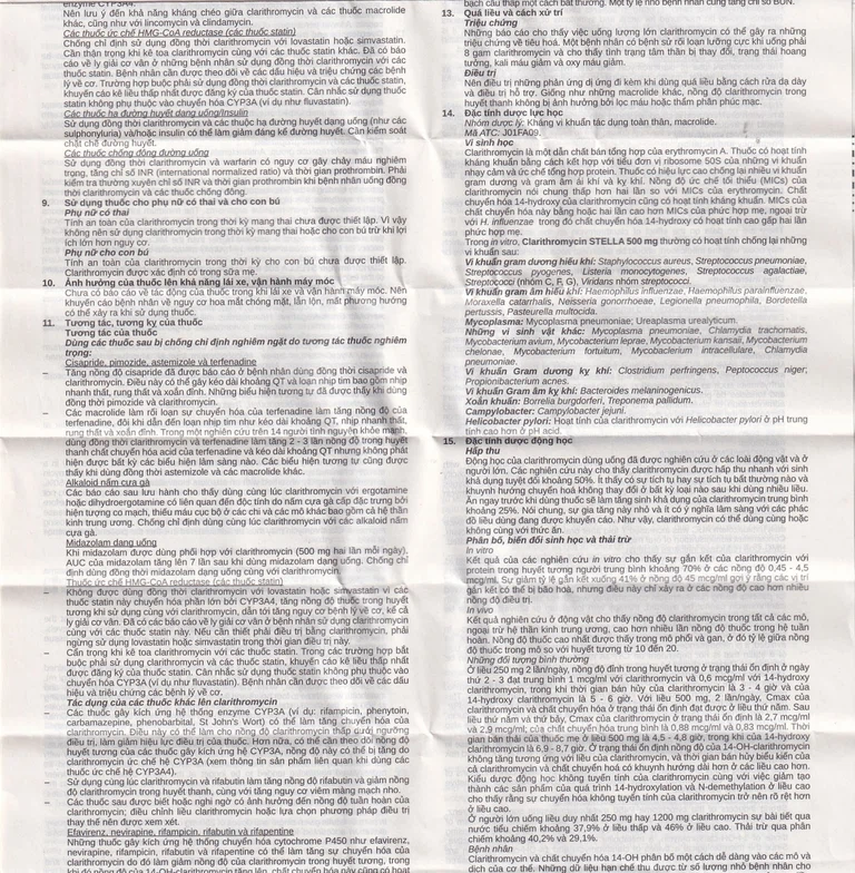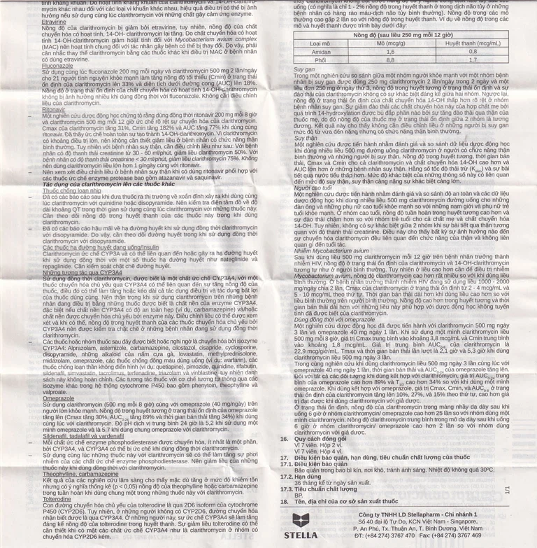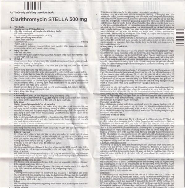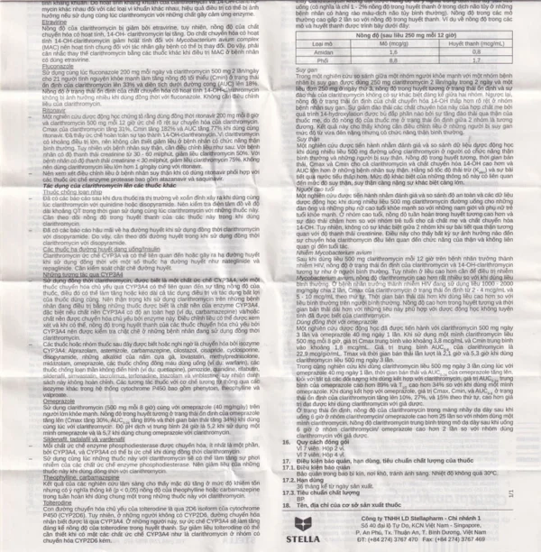 Mô tả ngắn: Thuốc Clarithromycin Stella 500mg dạng viên có thành phần chính là Clarithromycin 500mg là loại thuốc được sử dụng để điều trị nhiều bệnh nhiễm trùng do vi khuẩn. Thuốc cũng có thể được sử dụng kết hợp với các thuốc chống loét khác để điều trị một số dạng viêm loét dạ dày, ngăn ngừa nhiễm trùng do vi khuẩn.