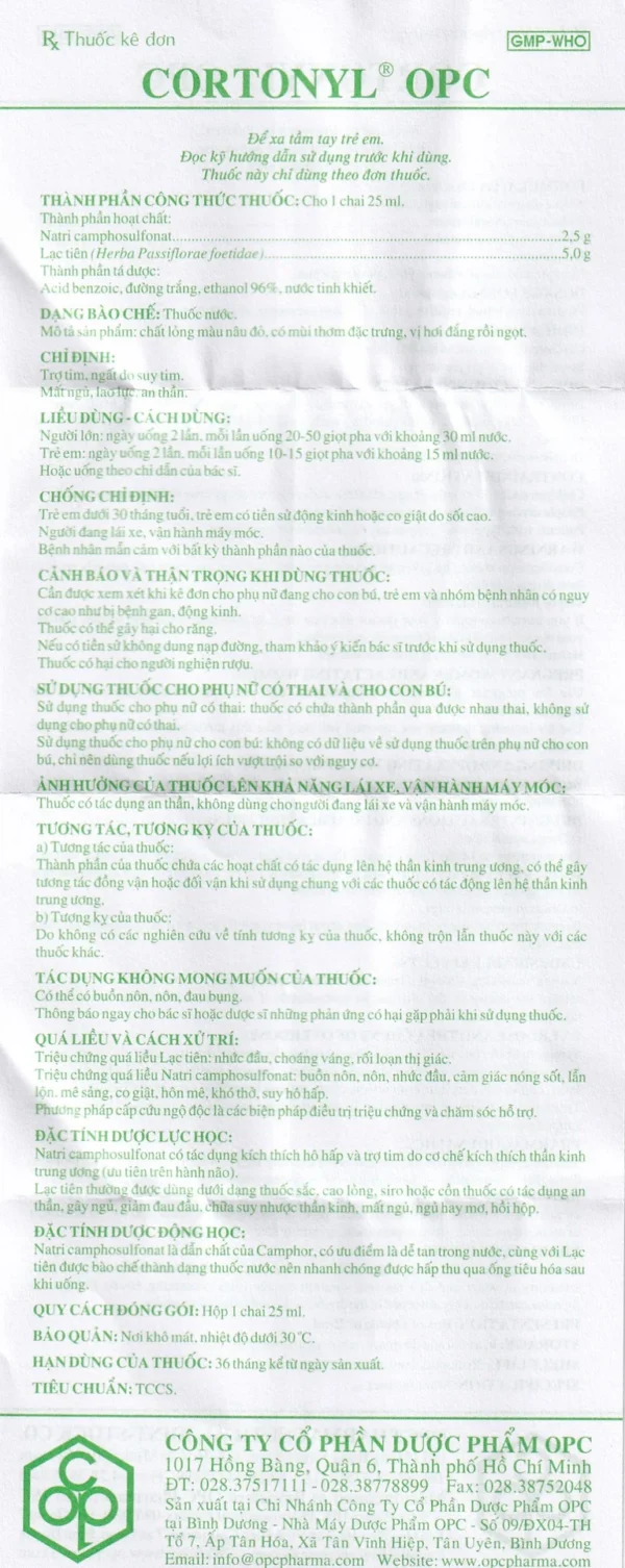 Mô tả ngắn: Cortonyl 25ml của Công ty Cổ phần Dược Phẩm OPC, thành phần chính natri camphosulfonat và lạc tiên. Đây là thuốc có tác dụng kích thích hô hấp, trợ tim và an thần, gây ngủ, giảm đau đầu, chữa suy nhược thần kinh, mất ngủ, ngủ hay mơ, hồi hộp được sử dụng để trợ tim, ngất do suy tim, điều trị mất ngủ, lao lực, an thần. Cortonyl 25ml có dạng lỏng màu nâu đỏ, có mùi thơm đặc trưng, vị hơi đắng rồi ngọt.