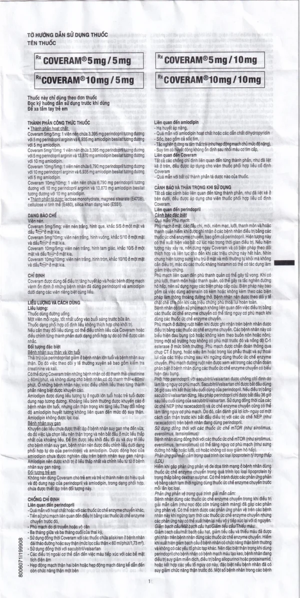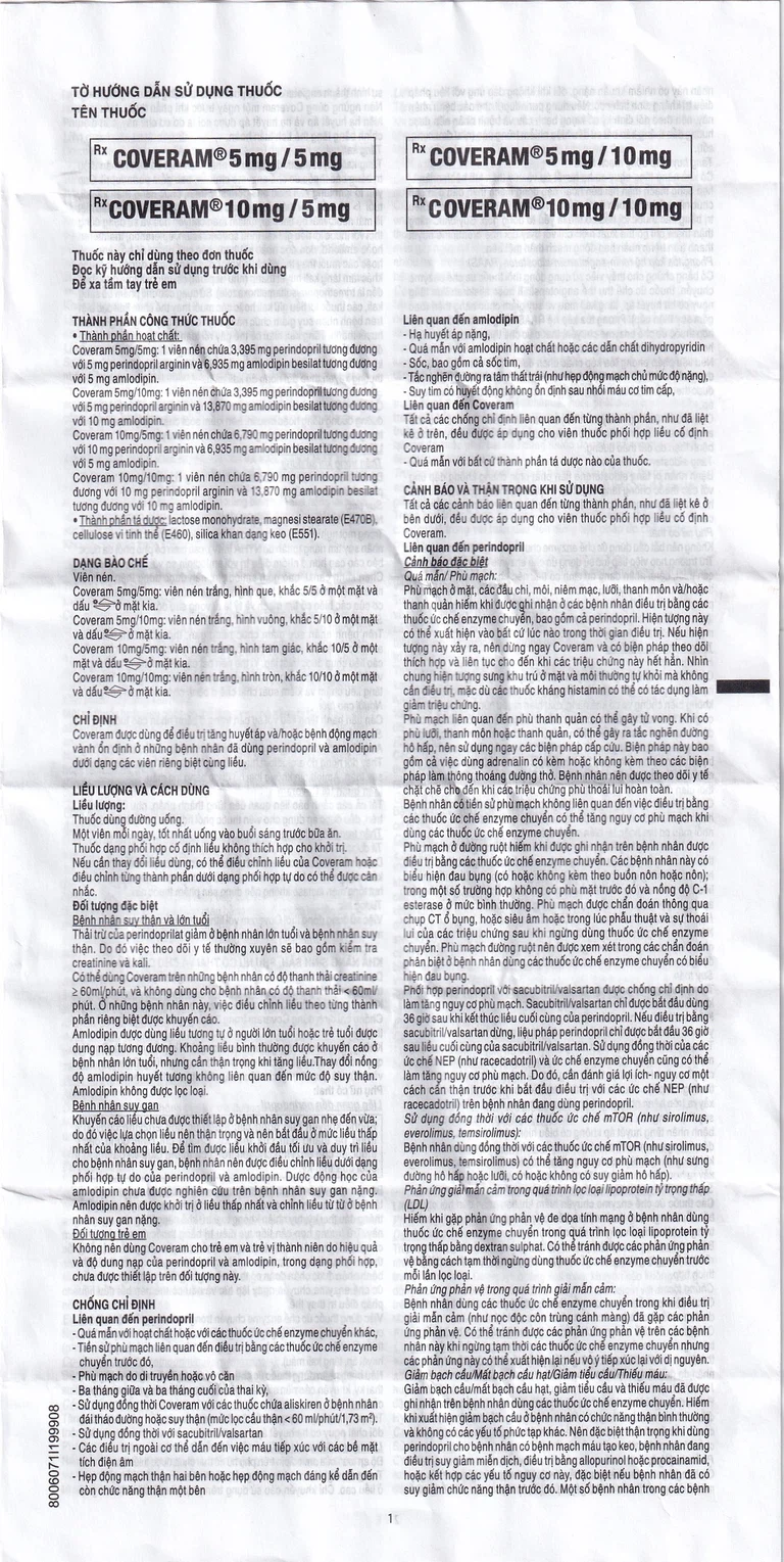 Viên nén Coveram 5mg/10mg màu trắng dùng đường uống, uống thuốc với một cốc nước, tốt nhất nên uống đúng một thời điểm vào buổi sáng trước bữa ăn.