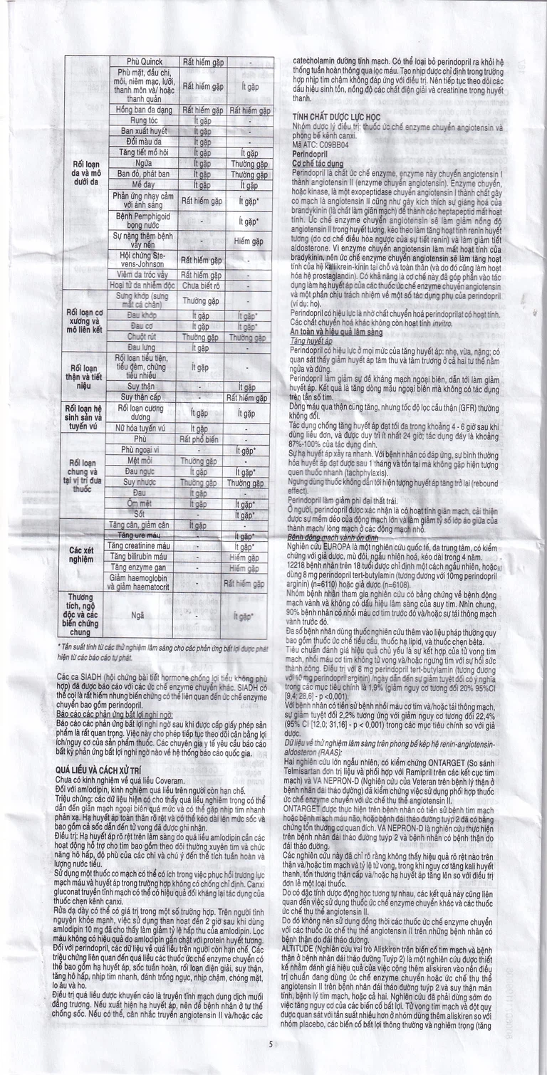 Đối với Perindopril, các dữ liệu về quá liều trên người còn hạn chế. Các triệu chứng liên quan đến quá liều các thuốc ức chế enzyme chuyển có thể bao gồm hạ huyết áp, sốc tuần hoàn, rối loạn điện giải, suy thận, tăng hô hấp, nhịp tim nhanh, đánh trống ngực, nhịp chậm, chóng mặt, lo âu và ho.