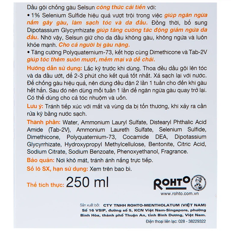 Dầu gội chống gàu Selsun Rohto hỗ trợ ngăn ngừa và cải thiện tình trạng gàu, dưỡng tóc khỏe mạnh (250ml)
