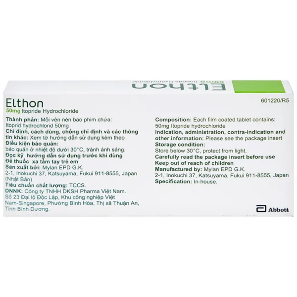 Thuốc Elthon 50mg của Công ty Abbott Japan Co., Ltd – Nhật Bản, thành phần chính Itoprid Hydrochlorid 50mg là loại thuốc được dùng để điều trị các triệu chứng dạ dày ruột gây ra bởi khó tiêu chức năng, khó tiêu không do loét (viêm dạ dày mãn tính): Đầy bụng, chướng bụng, đau/khó chịu vùng bụng trên, ăn mau no, chán ăn, ợ nóng, buồn nôn, nôn.