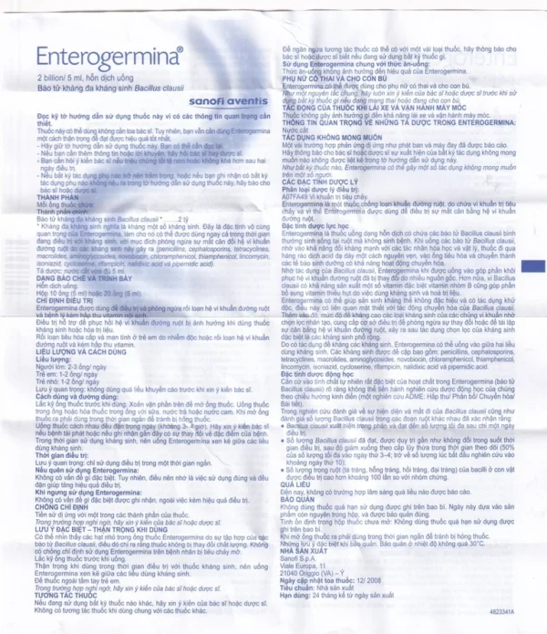 Enterogermina là thuốc uống dạng hỗn dịch có chứa các bào tử Bacillus clausii bình thường sinh sống tại ruột mà không sinh bệnh. Khi uống các bào tử Bacillus clausii, nhờ vào khả năng đối kháng mạnh với các tác nhân hóa học và vật lý, thuốc đi qua hàng rào dịch acid dạ dày một cách nguyên vẹn, vào ống tiêu hóa và chuyển thành các tế bào sinh dưỡng có khả năng hoạt động chuyển hóa.