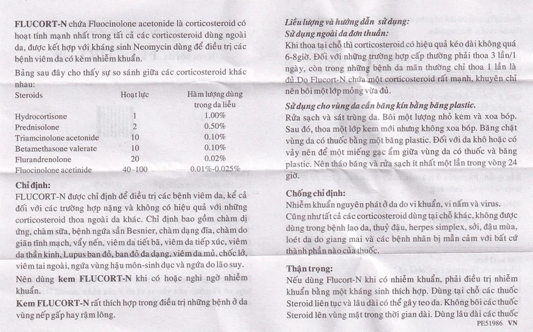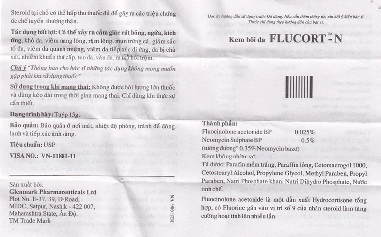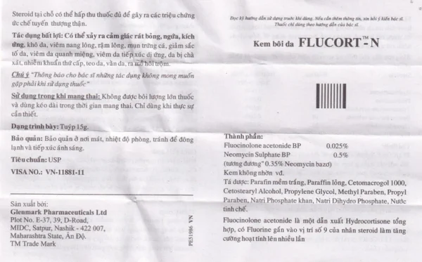 Mô tả ngắn: Với thành phần chính fluocinolone acetonide, neomycin sulfate, Flucort-N là thuốc dùng để trị viêm da, kể cả trường hợp nặng và không có hiệu quả với các corticoid dùng ngoài da khác. Chỉ định bao gồm chàm dị ứng, chàm sữa, bệnh ngứa sần Besnier, chàm dạng đĩa, chàm do giãn tĩnh mạch, vẩy nến, viêm da tiết bã, viêm da tiếp xúc, viêm da thần kinh, Lupus ban đỏ, ban đỏ đa dạng, viêm da mủ, chốc lở, viêm tai ngoài, ngứa vùng hậu môn – sinh dục và ngứa do lão suy. Flucort-N là thuốc kem bôi da hộp là một tuýp 15g của công ty Glenmark Pharmaceuticals Ltd. Thuốc nên sử dụng khi có nghi ngờ nhiễm khuẩn, rất thích hợp trong điều trị những bệnh ở da vùng nếp gấp hay rậm lông.
