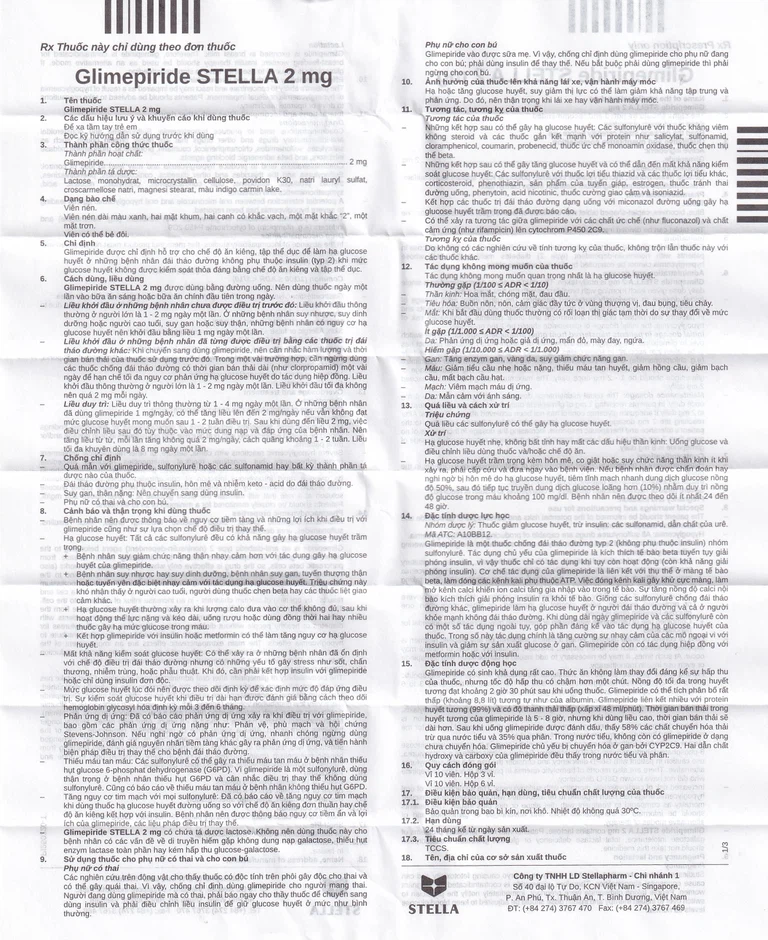 | Mô tả ngắn: | Thuốc Glimepiride 2mg của Công ty TNHH Liên doanh Stellapharm có thành phần chính Glimepirid 2mg là một loại thuốc được dùng để kiểm soát đường huyết cao ở những người bị bệnh tiểu đường tuýp 2, cùng với chế độ ăn uống và tập thể dục thích hợp. Glimepiride cũng có thể được sử dụng với thuốc trị tiểu đường khác.Việc kiểm soát đường huyết giúp ngăn ngừa tổn thương thận, mù lòa, các vấn đề thần kinh, dị tật chân tay và các rối loạn chức năng tình dục. Kiểm soát thích hợp bệnh tiểu đường cũng có thể làm giảm nguy cơ nhồi máu cơ tim hoặc đột quỵ. Glimepiride thuộc nhóm thuốc sulfonylurea. Glimepiride làm giảm đường huyết bằng cách làm giải phóng insulin tự nhiên trong cơ thể. |