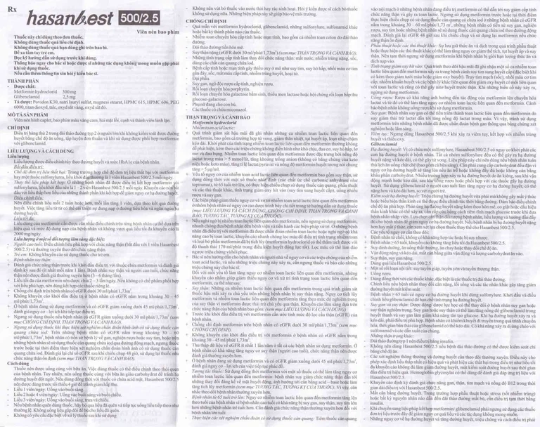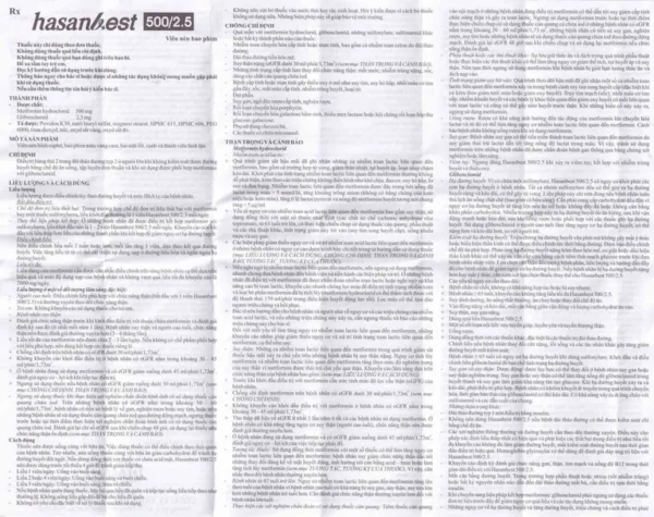 Điều chỉnh liều phù hợp với chức năng thận (bắt đầu với 1 viên Hasanbest 500/2.5) và thường xuyên theo dõi chức năng thận.