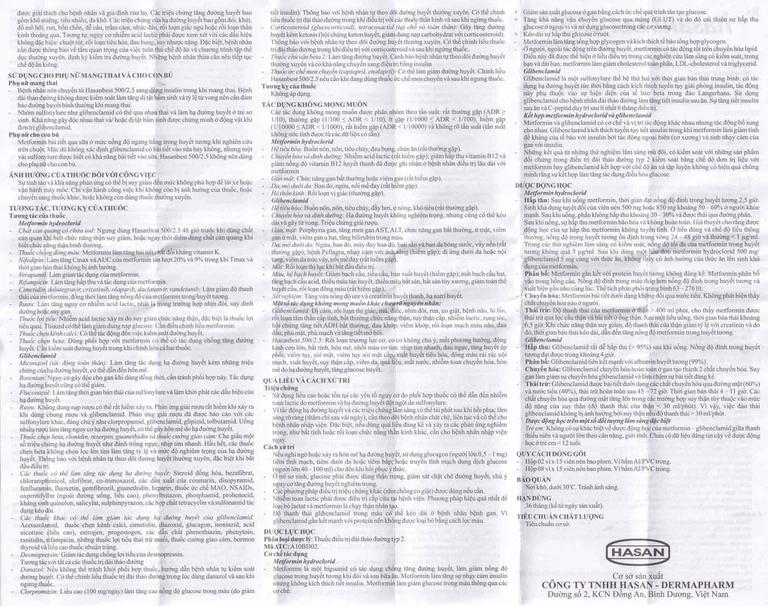 | Mô tả ngắn: | Hasanbest 500/2.5 là sản phẩm của Công ty TNHH Hansan-Dermapharm. Thuốc dùng để điều trị đái tháo đường tuýp 2 ở người lớn, khi không giải quyết được bằng chế độ ăn uống, luyện tập đơn thuần và khi sử dụng được phối hợp metformin với glibenclamid. Dạng bào chế là viên nén bao phim, thành phần chính metformin hydrochlororid 500 mg và glibenclamid 2,5 mg. Viên nén hình caplet, bao phim màu vàng cam, hai mặt lồi, cạnh và thành viên lành lặn. Gồm 2 vỉ x 15 viên. |