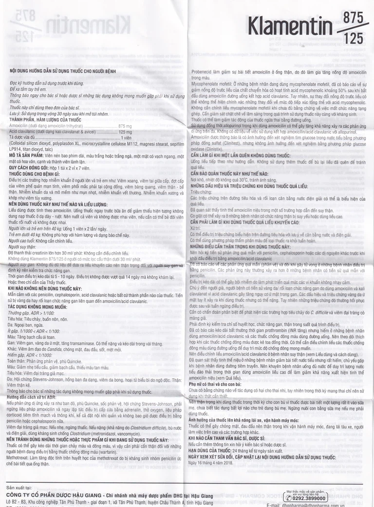 Mô tả ngắn: Thuốc Klamentin 1g hay còn gọi là Klamentin 875/125 là sản phẩm của Công ty Cổ phần Dược Hậu Giang, với thành phần chính gồm Amoxicilin và Acid clavulanic. Thuốc được dùng để điều trị ngắn hạn các nhiễm khuẩn đường hô hấp trên và dưới, đường tiết niệu sinh dục, da và mô mềm, xương và khớp và các nhiễm khuẩn khác như sẩy thai nhiễm khuẩn, nhiễm khuẩn sản khoa, nhiễm khuẩn ổ bụng. Klamentin có tính diệt khuẩn đối với nhiều loại vi khuẩn kể cả các dòng tiết beta-lactamase đề kháng với Ampicilin và Amoxicilin.
