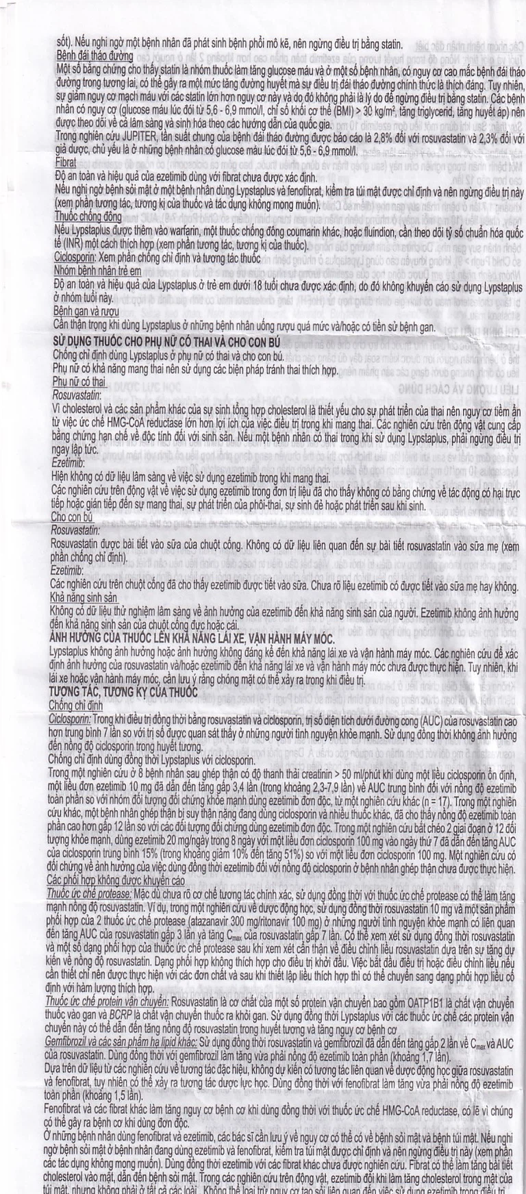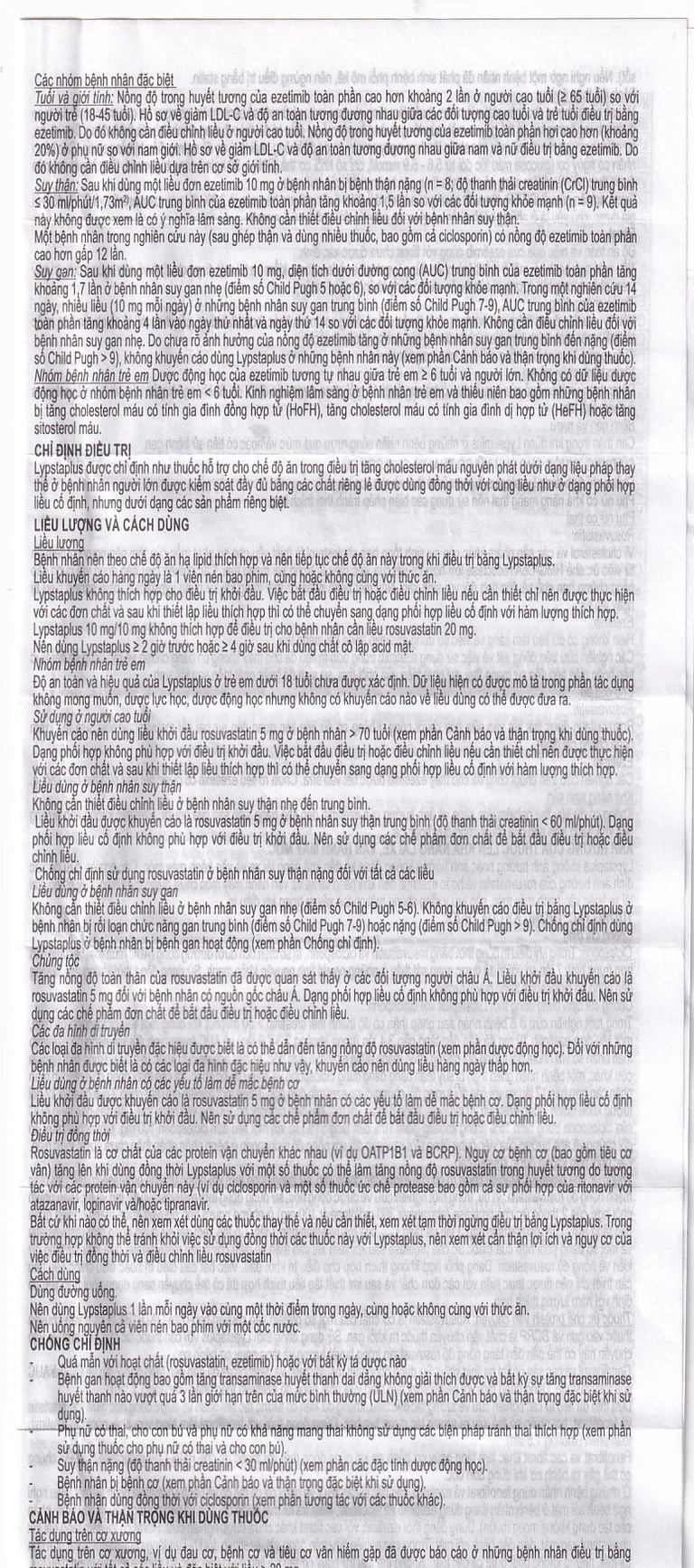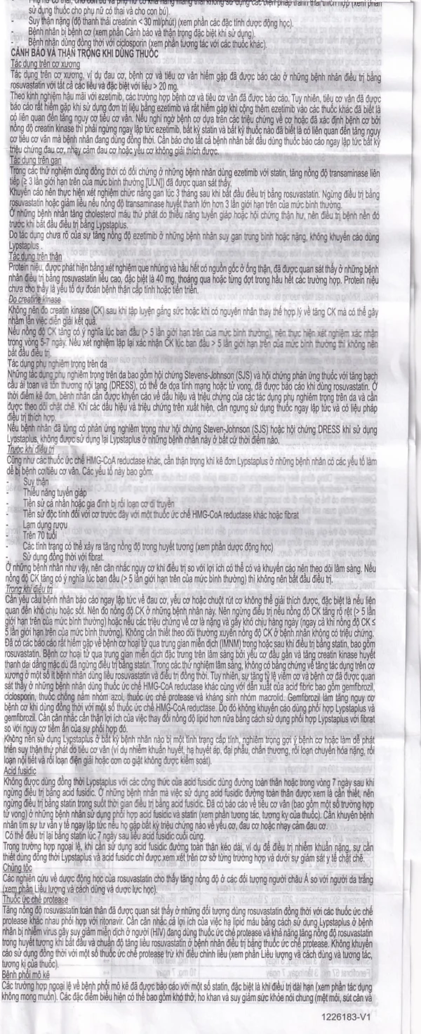 Các đa hình di truyền: Sự phân bố thuốc ức chế HMG-CoA reductase, bao gồm rosuvastatin, liên quan đến các protein vận chuyển OATP1B1 và BCRP. Ở những bệnh nhân có các đa hình di truyền SLCO1B1 (OATP1B1) và/hoặc ABCG2 (BCRP), có nguy cơ tăng nồng độ rosuvastatin. Các đa hình riêng lẻ SLCO1B1 c.521CC và ABCG2 c.421AA có liên quan đến nồng độ rosuvastatin (AUC) cao hơn so với các genotype SLCO1B1 c.521TT hoặc ABCG2 c.421CC. Việc định genotype đặc hiệu này không được thiết lập trong thực hành lâm sàng, nhưng đối với những bệnh nhân đã biết là có các loại đa hình này, nên dùng liều Lypstaplus hàng ngày thấp hơn.