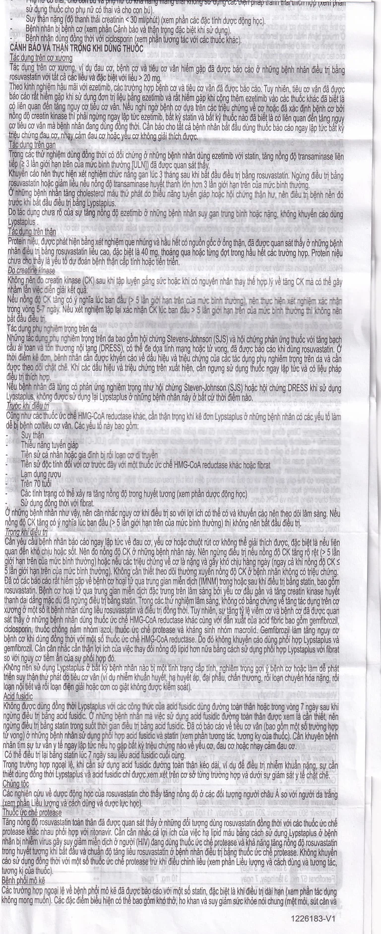 Ciclosporin: Trong khi điều trị đồng thời bằng rosuvastatin và ciclosporin, trị số diện tích dưới đường cong (AUC) của rosuvastatin cao hơn trung bình 7 lần so với trị số được quan sát thấy ở những người tình nguyện khỏe mạnh. Sử dụng đồng thời không ảnh hưởng đến nồng độ ciclosporin trong huyết tương.