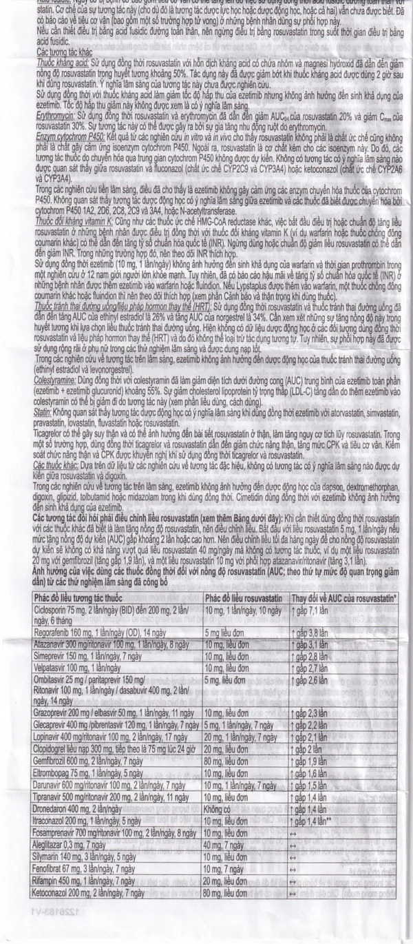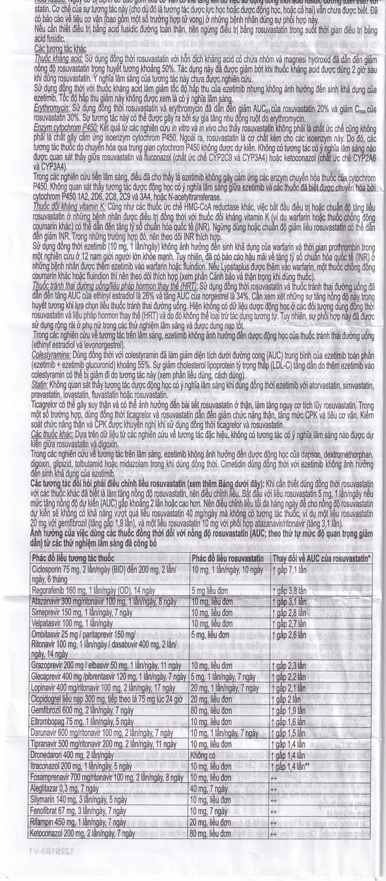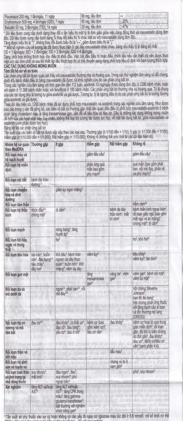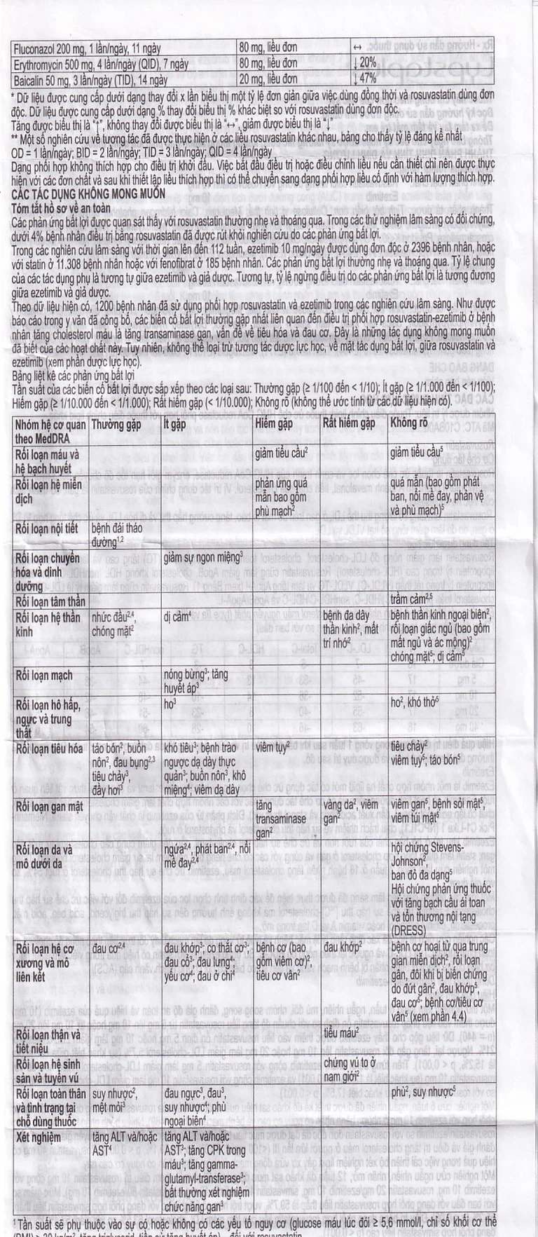 Sử dụng đồng thời rosuvastatin 10mg và ezetimib 10mg đã dẫn đến tăng diện tích dưới đường cong (AUC) của rosuvastatin gấp 1,2 lần ở các đối tượng tăng cholesterol máu. Không thể loại trừ tương tác dược lực học, về mặt tác dụng bất lợi, giữa rosuvastatin và ezetimib.