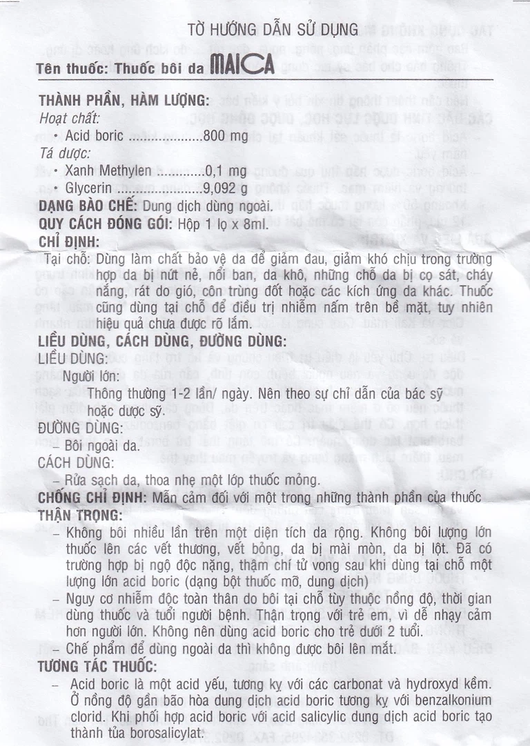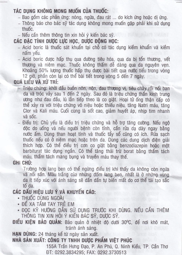 Không bôi nhiều lần trên một diện tích da rộng. Không bôi lượng lớn thuốc lên các vết thương, vết bỏng, da bị mài mòn, da bị lột. Đã có trường hợp bị ngộ độc nặng, thậm chí tử vong sau khi dùng tại chỗ một lượng lớn acid boric (dạng bột thuốc mỡ, dung dịch).
